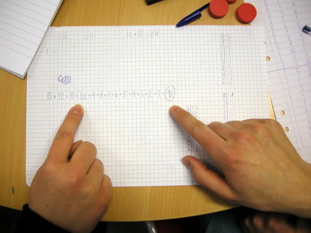 I posed the challenge of investigating how many possible problems there were using 12 counters and suggested the approach of investigating how many problems there would be for 3 counters. I scaffolded their learning by listing the elements {0,1,2,3} which introduced further set notation. We easily found 8 combinations and worked as a class to find the total of 10.