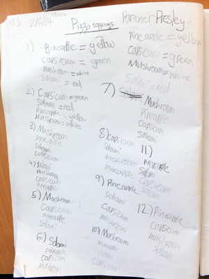 Oliver had an aversion to recording in the beginning, as evidenced by his effort for Task 196, Cross & Square (formerly Maltese Cross), even though he could have traced the pieces. This was March 18th. Later in his journal he records working on Task 183, Pizza Toppings, on both June 2nd and 13th and details three pages of possible pizzas. Whether or not he is correct in every aspect, the effort is clearly monumental in comparison to his first try.