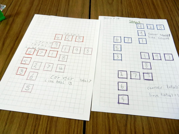 ![]() Teachers involved in Steps during a workshop day in Örnsköldsvik, Sweden Start the problem with a large set of nine digit cards you prepared earlier. Gather the students in a central place (tables or floor space) and hand out the cards. Ask the students with cards to arrange them to make a staircase. Now if we have put these down the right way, the total here ... will be the same as the total here ... and the total here ... and the total here ... All four line totals will be the same.Encourage participation with the group tiles for a while, to try to achieve this result then promise it can be done and send students to their tables in pairs to see who can be the first team to find a solution with their torn up tiles. Continue the lesson guided by the information above. Of course, you are doing this not because the mathematics content in the problem (as might be described by government curriculum documents) is of any great consequence, but rather because it is yet another powerful opportunity to model how a mathematician works. Therefore it is important to draw the lesson together with the students by asking them to tell you How we have worked like a mathematician today. For more ideas and discussion about this investigation, open a new browser tab (or page) and visit Maths300 Lesson 29, Steps, which also includes companion software. |